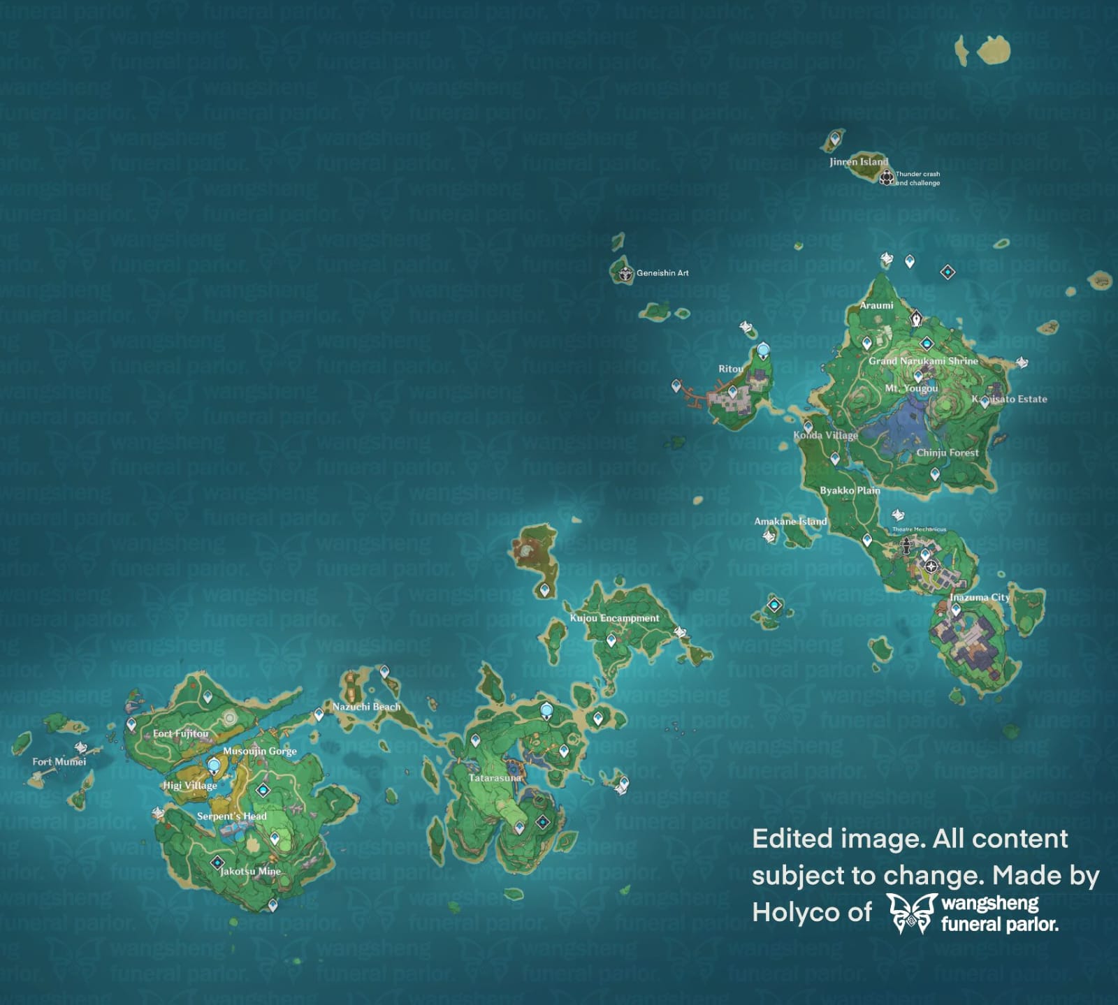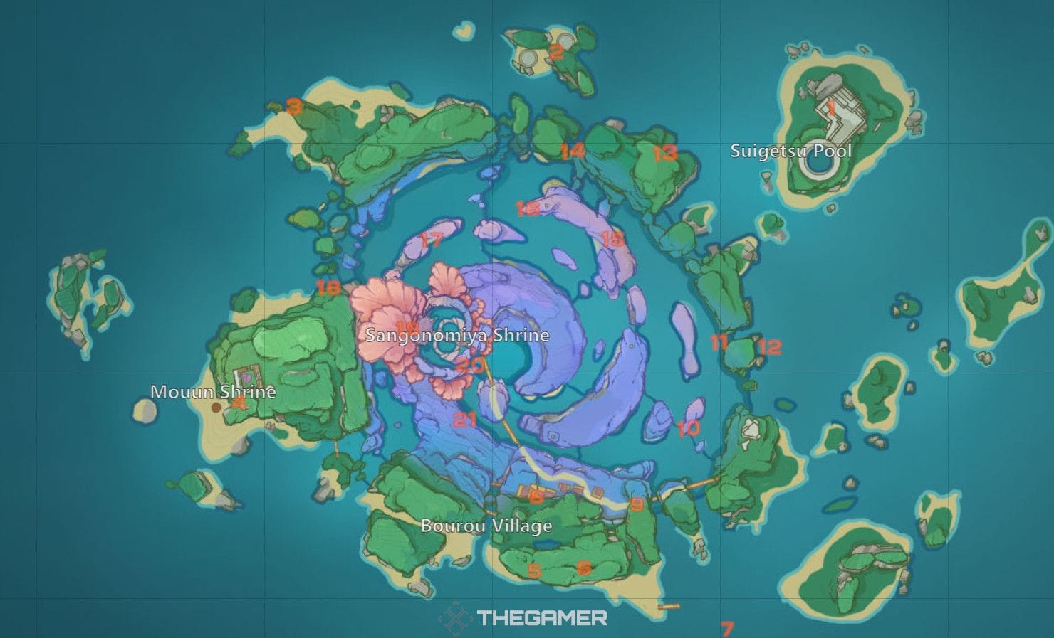 La geografía de Inazuma es diversa, con islas volcánicas, montañas y costas. Narukami es la isla principal, donde se encuentra la capital y el Gran Santuario Narukami. Watatsumi es una isla con una